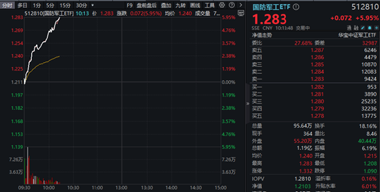 国防军工再爆发!盘中持续走高,场内热门国防军工ETF(512810)涨幅迅速扩大,直逼6%,场内最高价触及1.283元,创近2个月新高!实时成交额快速突破1亿元!