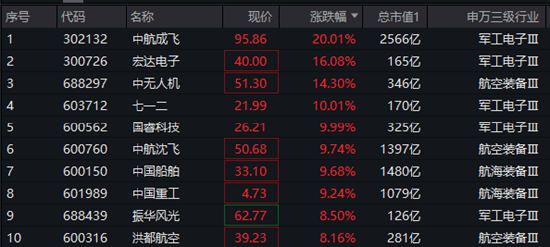 80只成份股涨幅中位数超4%,中航成飞再提20CM涨停板,宏达电子、中无人机涨超14%,七一二、国睿科技双双涨停封板,千亿市值权重股中航沈飞、中国船舶、中国重工涨超9%。